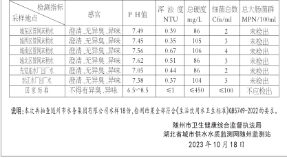 湖北省城市供水水質(zhì)監(jiān)測網(wǎng)隨州監(jiān)測站、隨州市衛(wèi)生健康綜合監(jiān)督執(zhí)法局根據(jù)《城市供水水質(zhì)管理規(guī)定》聯(lián)合于2023年10月17日對隨州市水務(wù)集團有限公司先覺廟水廠和封江水廠出廠水和16個管網(wǎng)末稍水水質(zhì)進(jìn)行了抽樣監(jiān)測,現(xiàn)將抽查檢測結(jié)果公告如下: