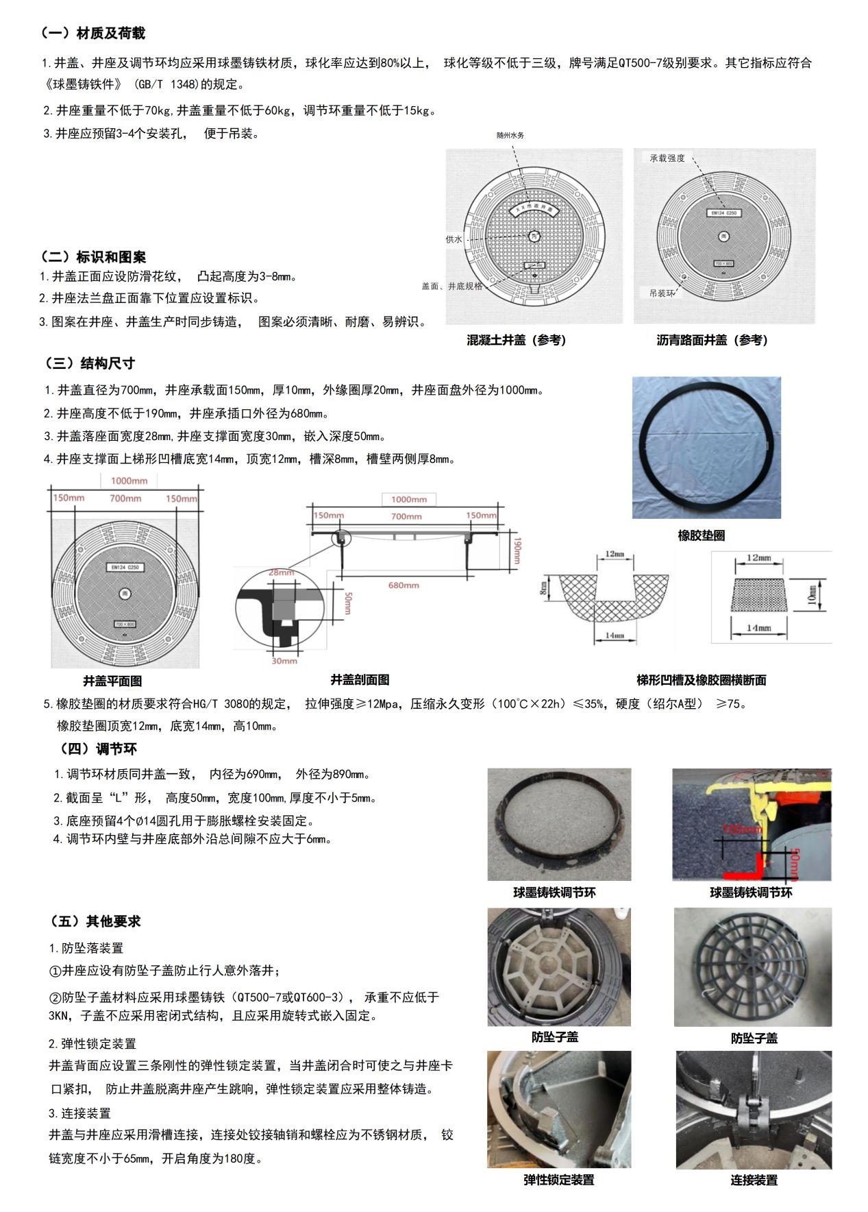 2、井蓋正面應(yīng)設(shè)防滑花紋,凸起高度為3-8mm;井座應(yīng)設(shè)有防墜子蓋防止行人意外落井防墜子蓋材料應(yīng)采用球墨鑄鐵(QT500-7或QT600-3),承重不應(yīng)低于3KN,子蓋不應(yīng)采用密閉式結(jié)構(gòu),且應(yīng)采用旋轉(zhuǎn)式嵌入固定。井座重量不低于70kg,井蓋重量不低于60kg,調(diào)節(jié)環(huán)重量不低于15kg(具體規(guī)格型號參照附件5);