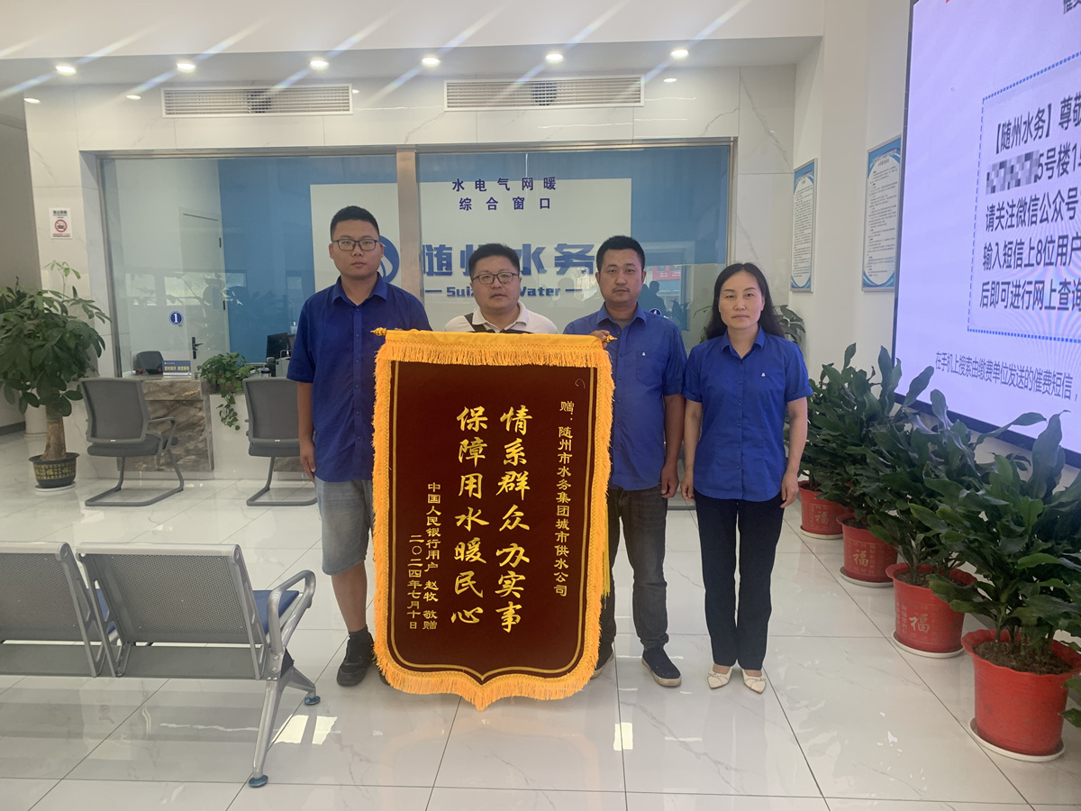 近日,中國人民銀行用戶將一面繡有“情系群眾辦實事 保障用水暖民心”的錦旗送到隨州市水務(wù)集團(tuán)城市供水公司共享營業(yè)廳。感謝運維中心維修人員急用戶之所急、憂用戶之所憂、真心為用戶考慮,解決其用水問題。