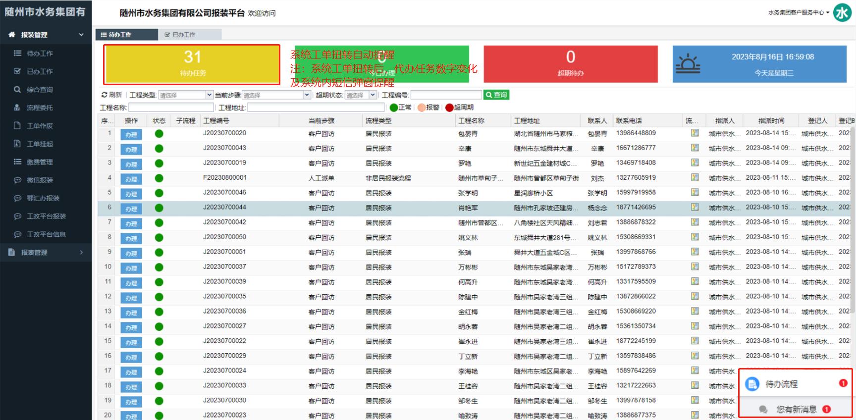 (4)報裝業(yè)務系統(tǒng)自動流轉(zhuǎn)提醒,功能界面截圖