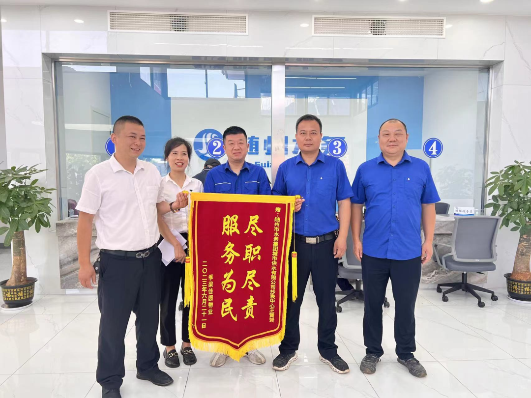 季梁佳園物業(yè)將一面錦旗送到城市供水公司工作人員手中,以表達對該公司供水服務的深深感激之情。錦旗上印著“盡職盡責 服務為民”八個大字,表達了物業(yè)和用戶對營抄中心的王赟赟等工作人員提供的認真高效、熱情周到的優(yōu)質服務表示高度贊揚和誠摯的感謝!